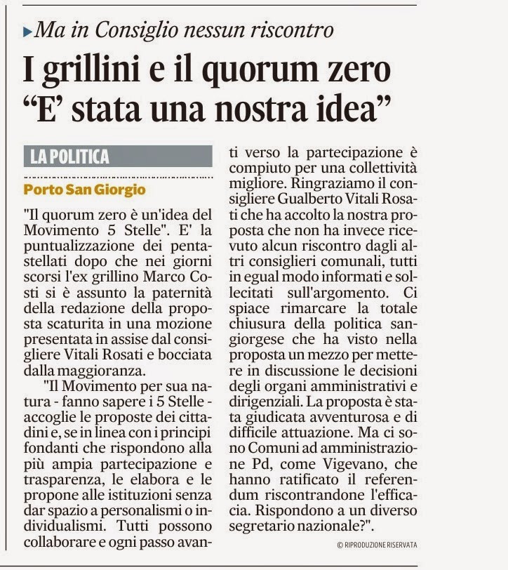 La stessa struttura politica del Movimento 5 Stelle si è autoesclusa dal poter essere parte attiva del Consiglio Comunale per un masochistico desiderio di non fare alleanze con chiunque somigli ad un partito o ad una lista civica, con il bel risultato che a Porto San Giorgio i voti raccolti dal Movimento 5 Stelle, un bel 7%, non hanno partorito neppure un consigliere. Questo, se da una parte ha galvanizzato i Grillini ebri di una originalità sterile, dall'altra ha impedito agli stessi di poter avere voce in capitolo nello stesso Consiglio Comunale, e di conseguenza li ha “costretti” a regalare le loro idee agli altri sperando che le possano realizzare.